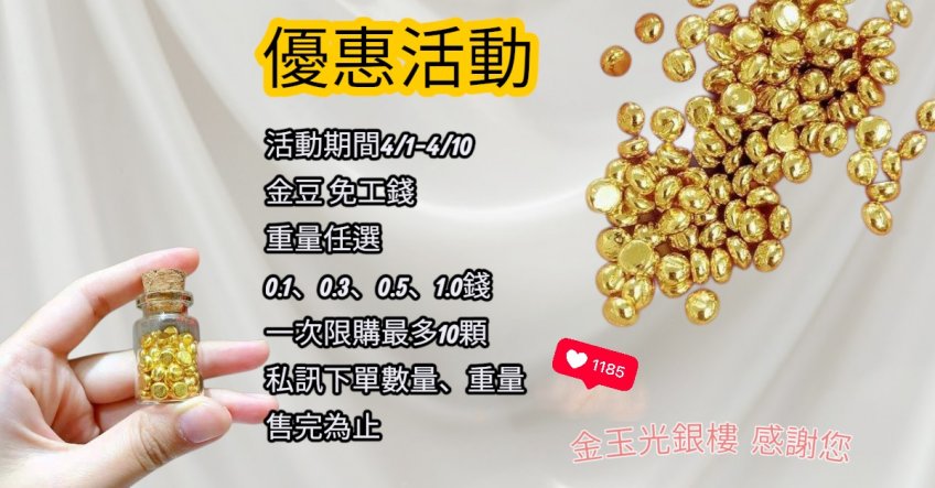 活動期間(4/1-4/10)為期10天 金豆 免工錢 免工錢 免工錢 重量任選 0.1、0.3、0.5、1.0錢 一次限購最多10顆 私訊下單數量、重量,可選擇瓶裝、袋裝 依照當下浮動牌價計算價格 售完為止